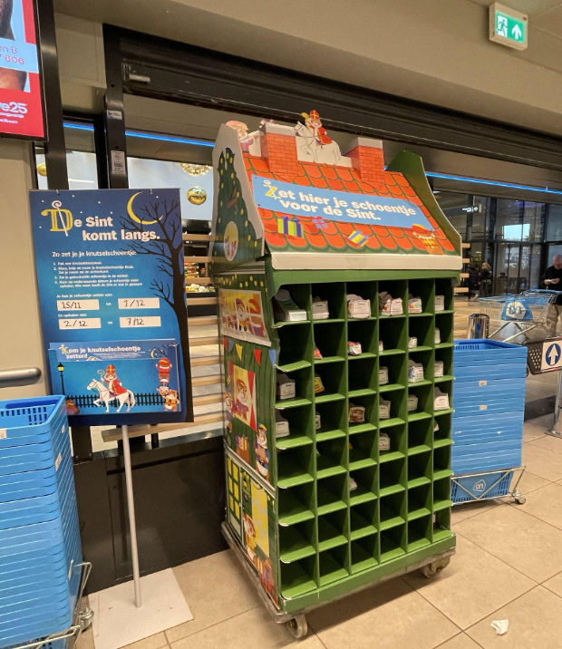 スーパーには子供用イベントの靴箱が設置されています。本来は自宅の玄関か暖炉の前にシンタクラースの白馬のエサを入れた靴を置いておくとその中にプレゼントを入れてもらえるらしいのですが、スーパーでは紙製の靴を作って名前を書いて店頭の靴箱に入れておくと、小さなプレゼントを入れて戻して置いてくれるらしいのです。この対面じゃないけど自分で取りに行かなきゃいけない感じも私は好きだなぁ、結構テキトーでいい加減なシステム、だけど表層的じゃない大人の心意気が見え隠れしてる感じ。子どもは直感的で賢いから意外とそういうのが好きなんじゃないですかね。。。